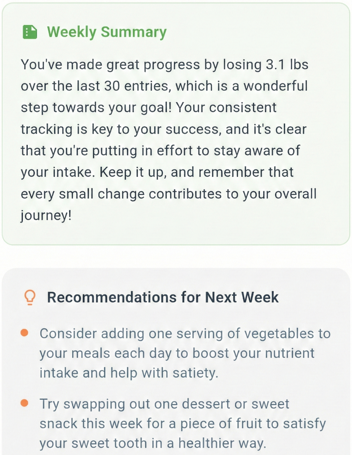Flun adjusts your daily targets based on what you eat and what you do. Your long-term goals stay under your control, with small nudges from the AI coach to help you stay on track.